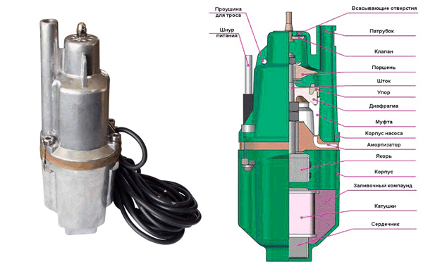 - Вибрационные. Такому насосу присуще наличие внутренней диафрагмы. В конструкции создается электромагнитное поле, которые обеспечивает втягивания воды в систему насоса. Такой тип оборудования относится к погружным системам.