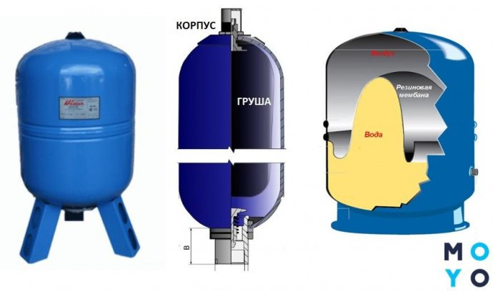 В сети вы можете найти разные названия гидроаккумулятора. Например, гидробак или мембранный бак. В металлической оболочке помещается грушевидная форма. По своей конструкции он разделен на две части, которые заполнены водой и воздухом. Сама мембрана крепится с помощью патрубка.