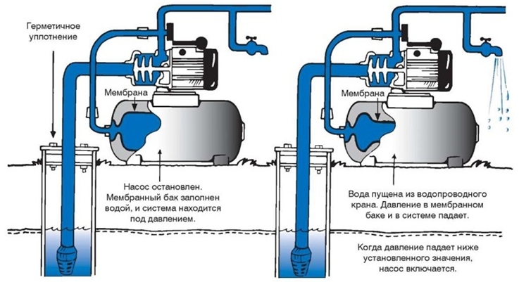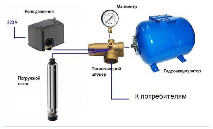 Погружной насос должен будет перекачивать воду из источника на глубине в гидробак. В нем регулируются значения давления. При достижении максимальных показателей на реле, оборудование автоматически отключается. Поскольку в гидроаккумуляторе будет запас воды, вы можете использовать ее.
