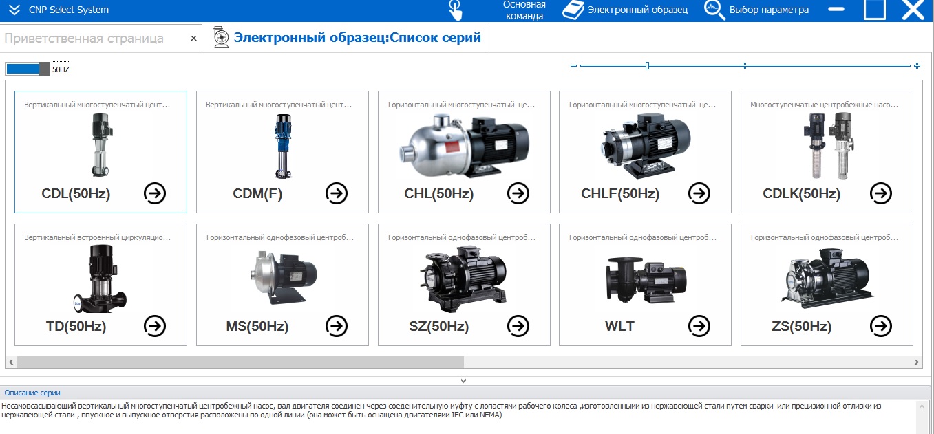 После активации программы в ней будут доступны все виды насосов, производимых компанией CNP. Программа обновляется через интернет, при обновлении ассортиментная линейка представленных насосов расширяется. Для регистрации использовать свой логин и пароль. После регистрации вы получите доступ к необходимой технической информации по конкретному типу и модели насоса.